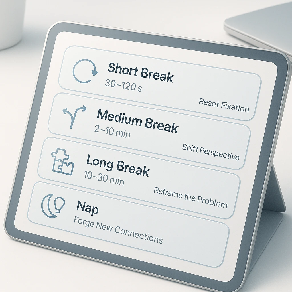 For difficult problems prone to fixation, short‑to‑medium step‑aways make it easier to reframe. When resuming, decide “the first small step” in one sentence and start moving your hands; this makes returning easier.