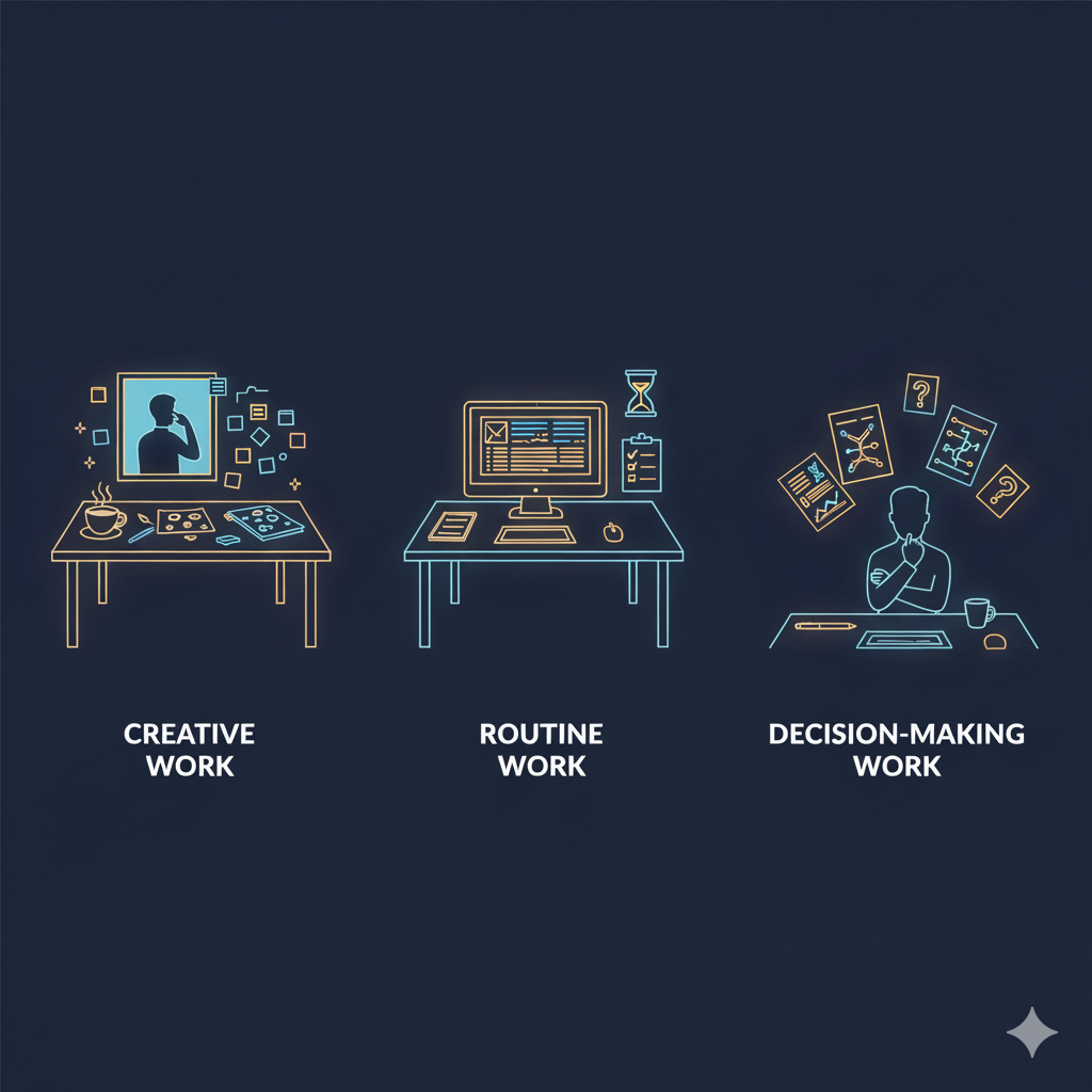 | By Work Type | Creative / Routine / Decision‑heavy | Creative: brief step‑away; Routine: periodic rests; Decision: write it out, then rest | The meaning of each sign changes with the nature of the work. |
