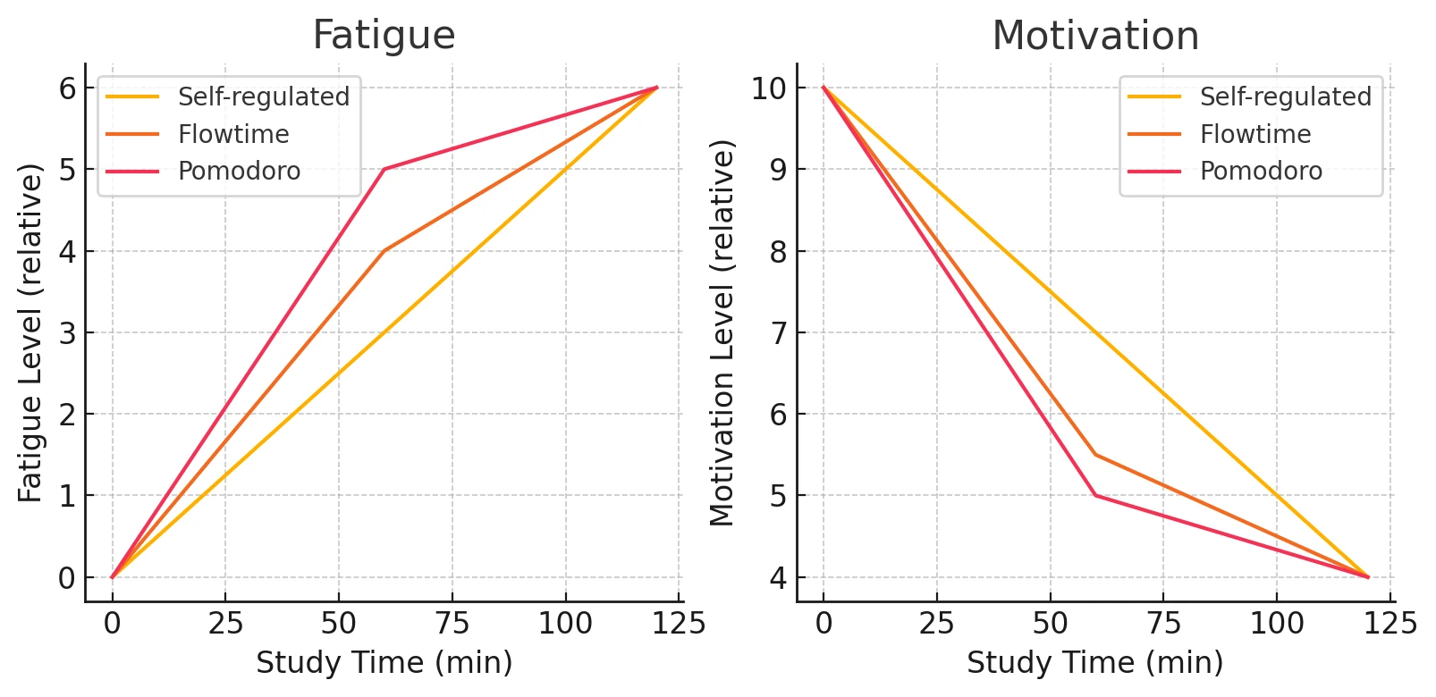 Figure 1: Conceptual trajectories of fatigue (left) and motivation (right) over time by break‑taking technique. The vertical axis shows relative subjective levels (higher = higher motivation / stronger fatigue). The horizontal axis shows elapsed study time (0–120 minutes). Red = self‑regulated, orange = Flowtime, pink = Pomodoro.